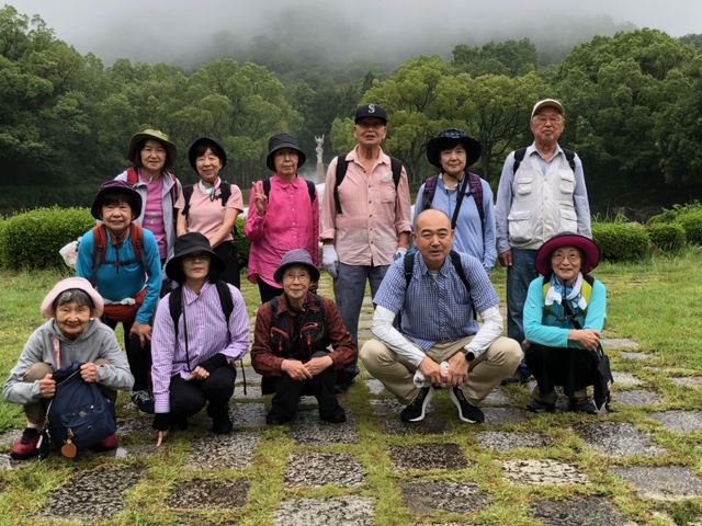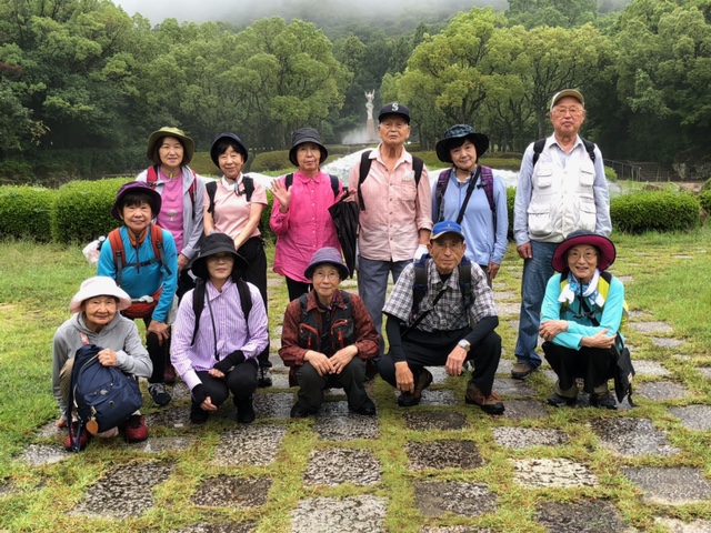 10時阪急「甲陽園駅」をスタート、大師道の坂道を1時間近く歩き甲山森林公園から入ろうとすると雨が降ってきました。ちょうど公園に入ったところにパークセンター管理棟があったので雨宿りをし降りやんだところでシンボルゾーンに向かって歩きました。ここには高さ8mの「愛の像」が建っており、それを囲むように霧噴水が上がっていました。また雨が降ってきたので近くの「記念広場」に移動し屋根があり椅子もあるところがあったので、ここで昼食にしました。この広場には故金井元彦兵庫県知事の記念モニュメントがありました。故人の信条であった「愛情」をテーマとして彫刻家制作の「少年少女と子犬のブロンズ像」が建立されていました。食後再びシンボルゾーンに戻って噴水、甲山をバックに記念写真を撮りましたが、あいにくの雨で甲山は霞んで撮れていません。