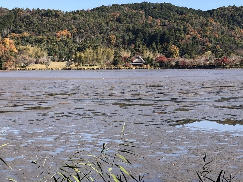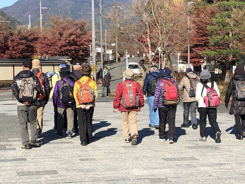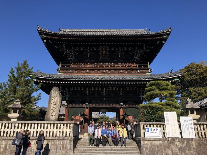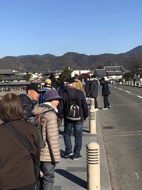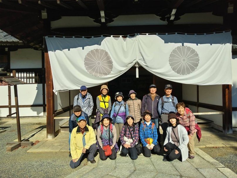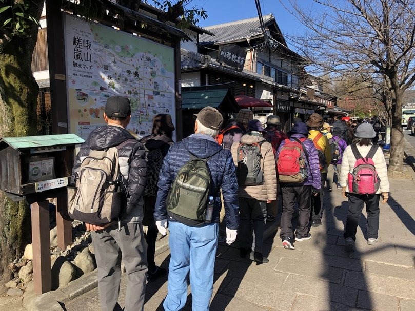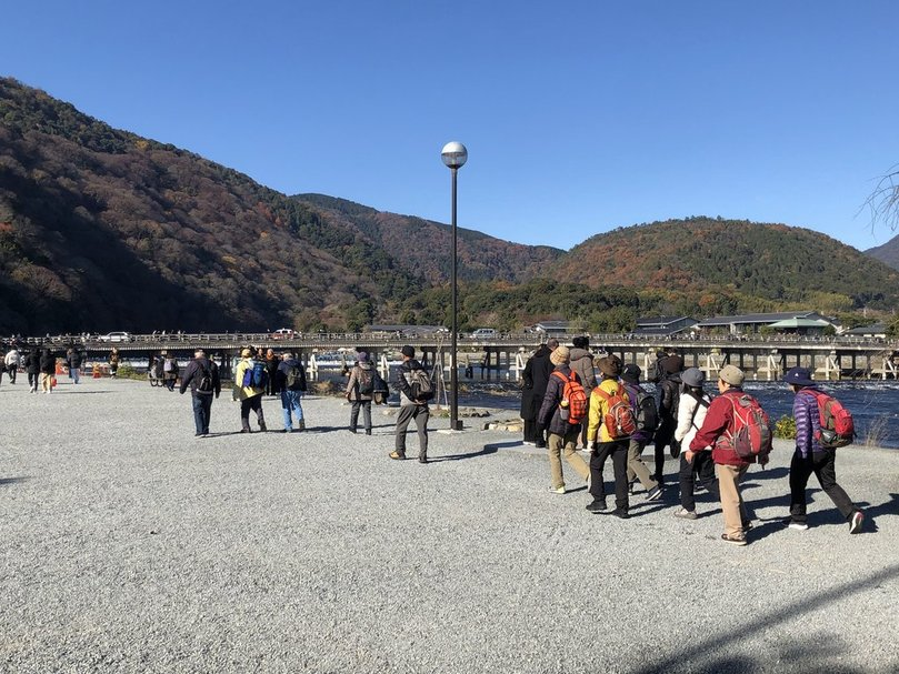 10時阪急「嵐山駅」スタート。しばらく桂川沿いに歩き渡月橋を渡って人通りの多い天龍寺の前を通り、嵐電「嵐山駅」を通りJR嵯峨野線を越えて真っすぐ北に向かって歩くと清凉寺(佐賀釈迦堂)に着きました。ここは源氏物語にゆかりのある史跡で光源氏が造営した寺院と言われています。幅10m、高さ18mの山門は幾度かの焼失を繰り返したのちに江戸時代後期(1774年)に再建されました。少し歩いて大覚寺に到着、嵯峨天皇1200年に離宮として建てられ南北朝時代の「南朝・北朝合体」の講和会議が行われた場所です。このあと「千代の古道」を広沢池まで歩きました。千代の古道は平安時代に天皇や貴族が都から嵯峨野の大覚寺へ牛車に乗って通ったとされる古道で、多くの和歌が詠まれています。広沢池は8世紀ごろ洛西地域一帯を秦氏が開墾した時に農業用水とするためその原型が造られたと言われています。ちょうどこの日広沢池では「鯉揚げ(こいあげ)」という伝統行事で水抜きが行われており池の底が現れており鯉やフナが販売されていました。昼食を摂ったあと当初の予定地仁和寺には向かわず14時ごろJR太秦駅に到着、ここでJR「嵯峨嵐山駅」に向かう人とJR「京都駅」に向かう人に別れ解散しました。