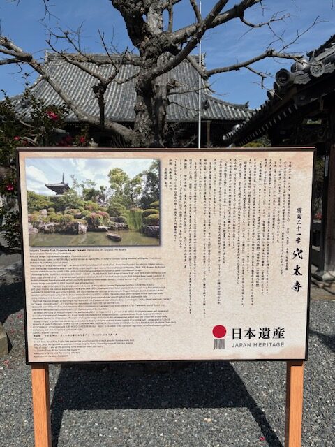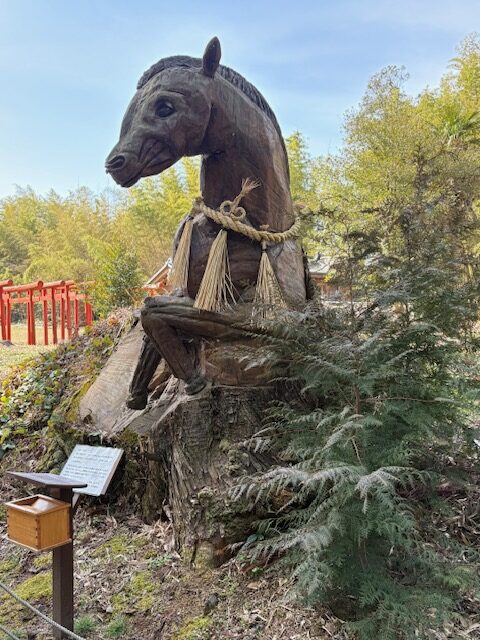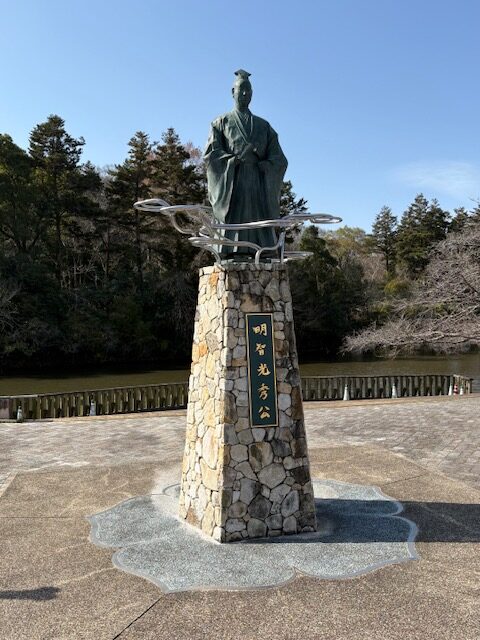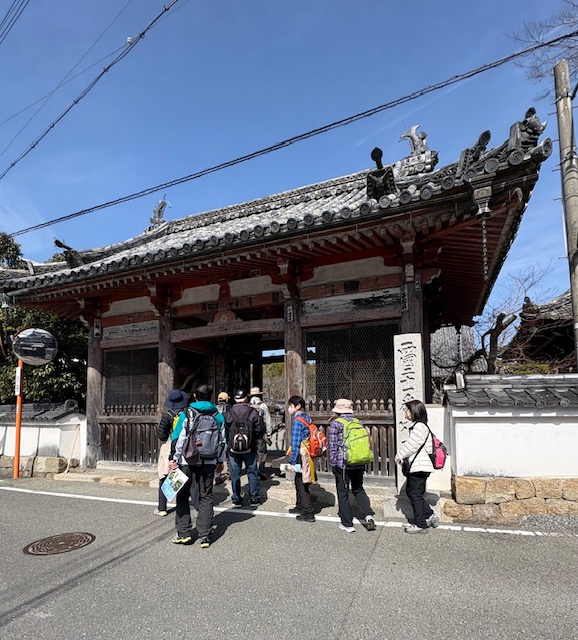 亀岡駅を10時少し前にスタート、少し歩いたところの公園に明智光秀の立像がありました。橋を渡って丹波亀岡城跡へ、宗教法人「大本」の看板があるところから入ると梅林がありちょうど見ごろを迎えていました。明智光秀は天正5年(1577)ごろ丹波攻略の拠点とするために亀岡城を築城しました。城は明治維新のあと廃城となり紆余曲折の末荒れ果てた城跡を「大本」が入手し現在に至っています。城跡を抜けて市役所の方に向かって歩き道の駅「ガレリアかめおか」に到着。全面がガラス張りのモダンな複合施設で図書館、生涯学習施設、子供広場などが併設されるユニークな道の駅です。地元の新鮮な野菜、特産物などが並び亀岡牛コロッケが人気です。ガレリアはイタリア語で「屋根のある商店街」といった意味だそうです。道の駅をあとにして田んぼの中をしばらく歩き京都縦貫自動車道をくぐって走田(はせだ)神社へ、奈良時代に創建されました。映画やドラマなど時代劇の撮影が行われることが多いようです。8年ほど前の台風で倒れた木の根元部分にチエンソーアートによって馬の上半身が彫られていました。次に西国観音霊場二十一番札所穴太寺へ、本尊に安置されている釈迦如来般若像(なで仏)は、願いを込めながら自分の体の悪いところと同じ部分をなでるとご利益があるとされています。境内には大きなムクの木があり寺の歴史が感じられました。。参拝後道の駅まで引き返しここで昼食を済ませて一服した後亀岡駅まで歩き2時半ごろの電車に乗って京都駅に向かいここで解散しました。